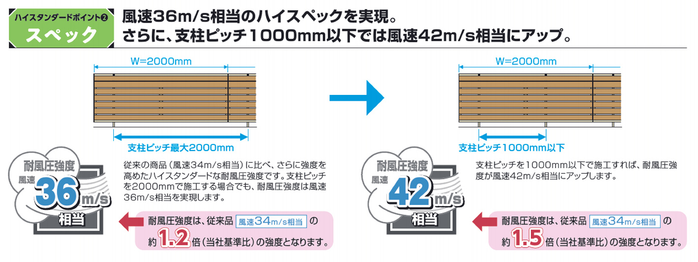また、支柱のピッチを狭くすることによって耐風圧強度がアップします。