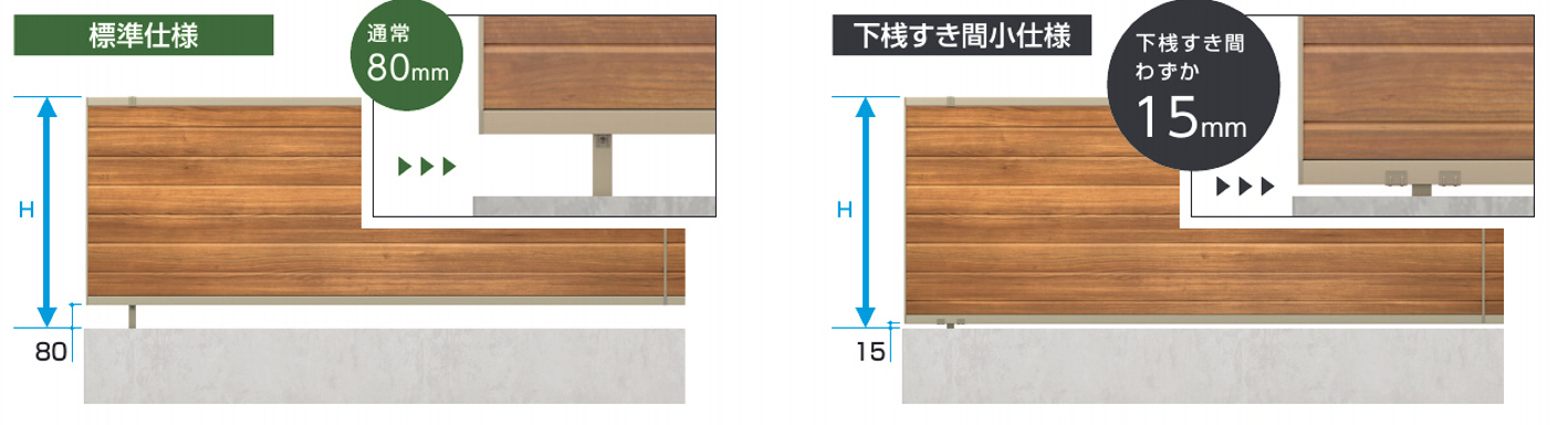 標準仕様では下桟のすき間が80mmですが、下桟すき間小仕様にすると