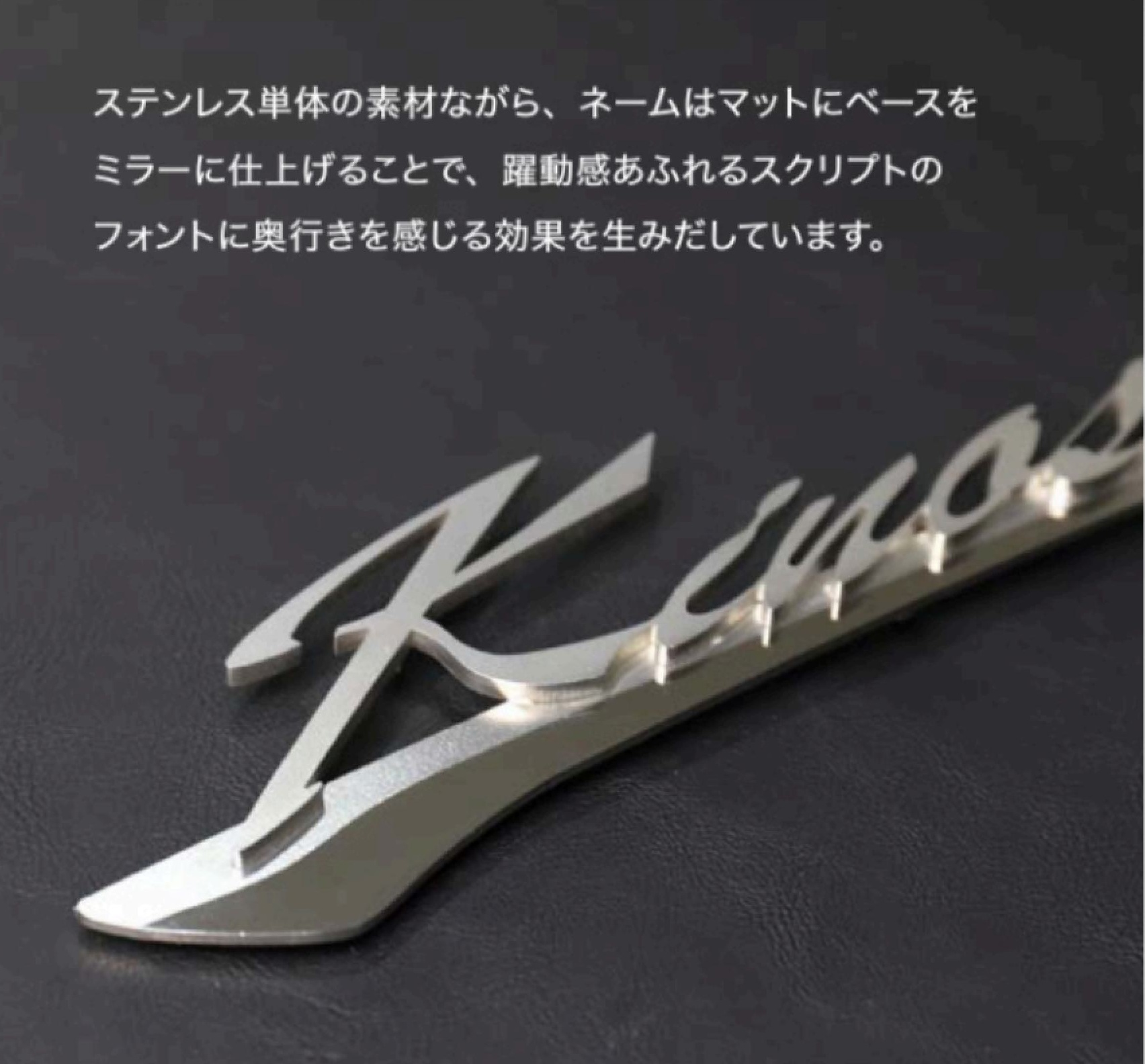 ネーム部分とベース部分は異なる仕上げ方法を用い、躍動感あるフォントで奥行感を生み出しています。