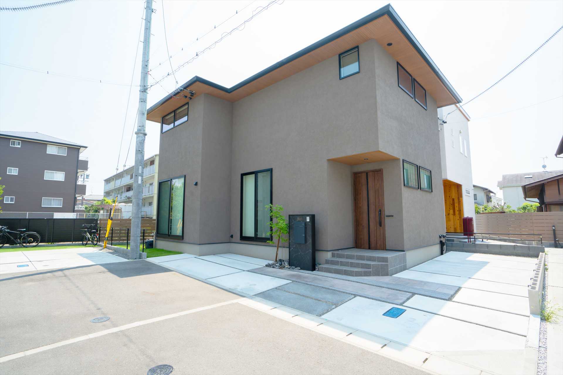 優しいベージュの建物に合わせて、外構もトーンを揃えてシックで落ち着いた雰囲気に。