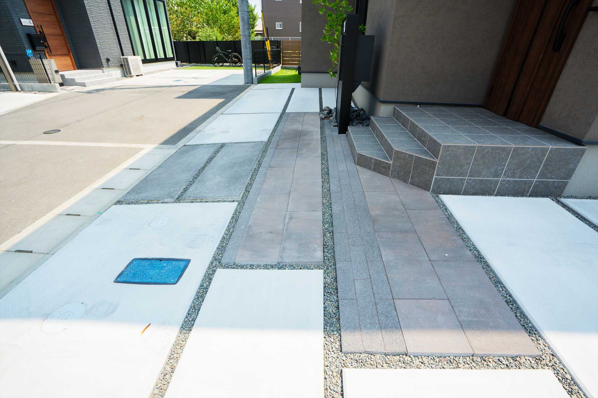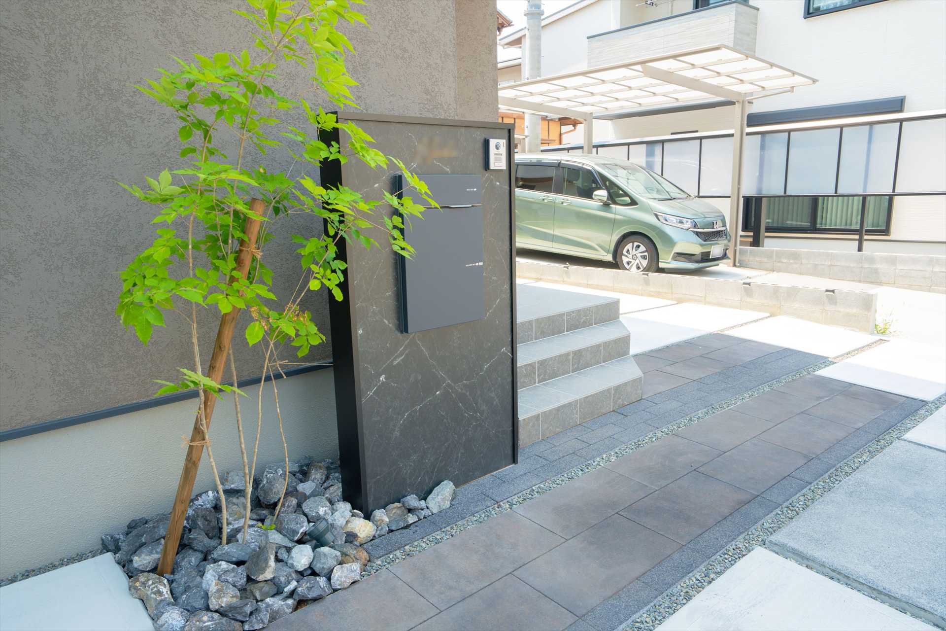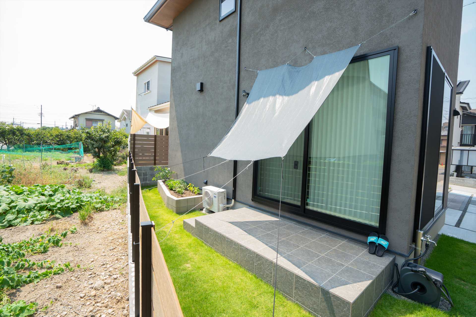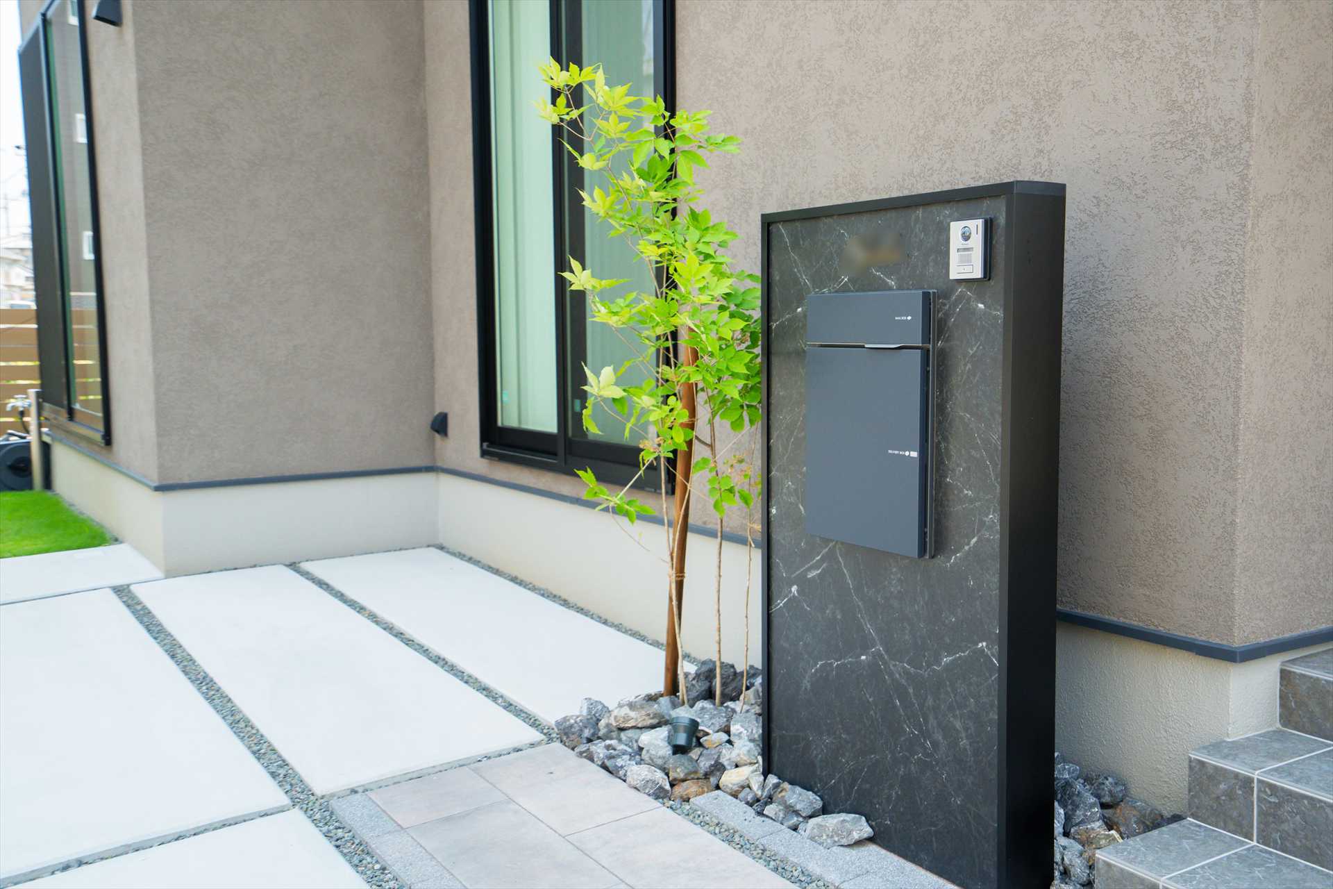 石目調の門袖は、駐車を妨げないスマートな動線と意匠性を両立、シンボルツリーが程よい抜け感を与え、足元の割栗石が都会的なデザインに自然の力強さを添えます。目隠しフェンスで守られたプライベートガーデンには、美しい天然芝と家庭菜園を愉しめる空間が広がり、機能性と暮らしの豊かさが共鳴することで、建物の美しさを最大限に引き立てる住まいが完成しました。