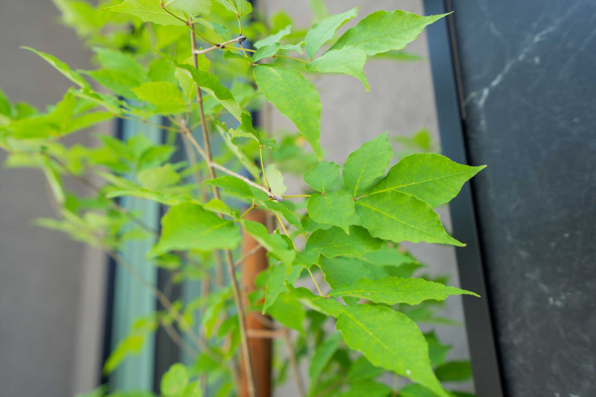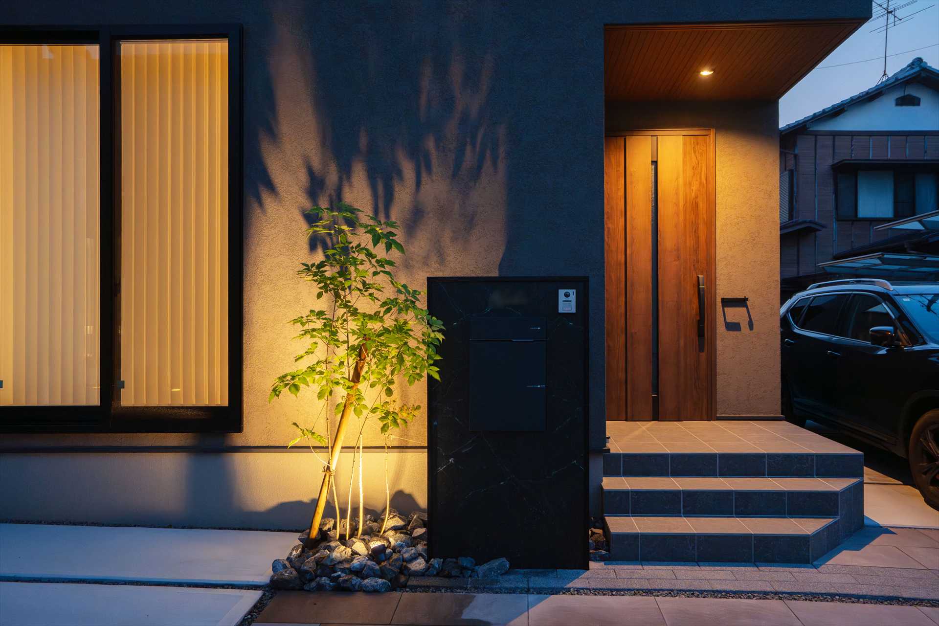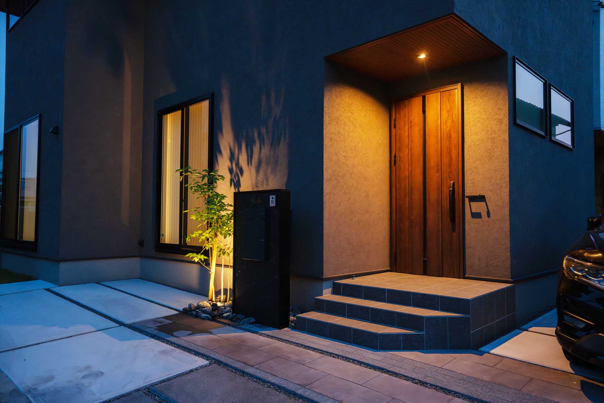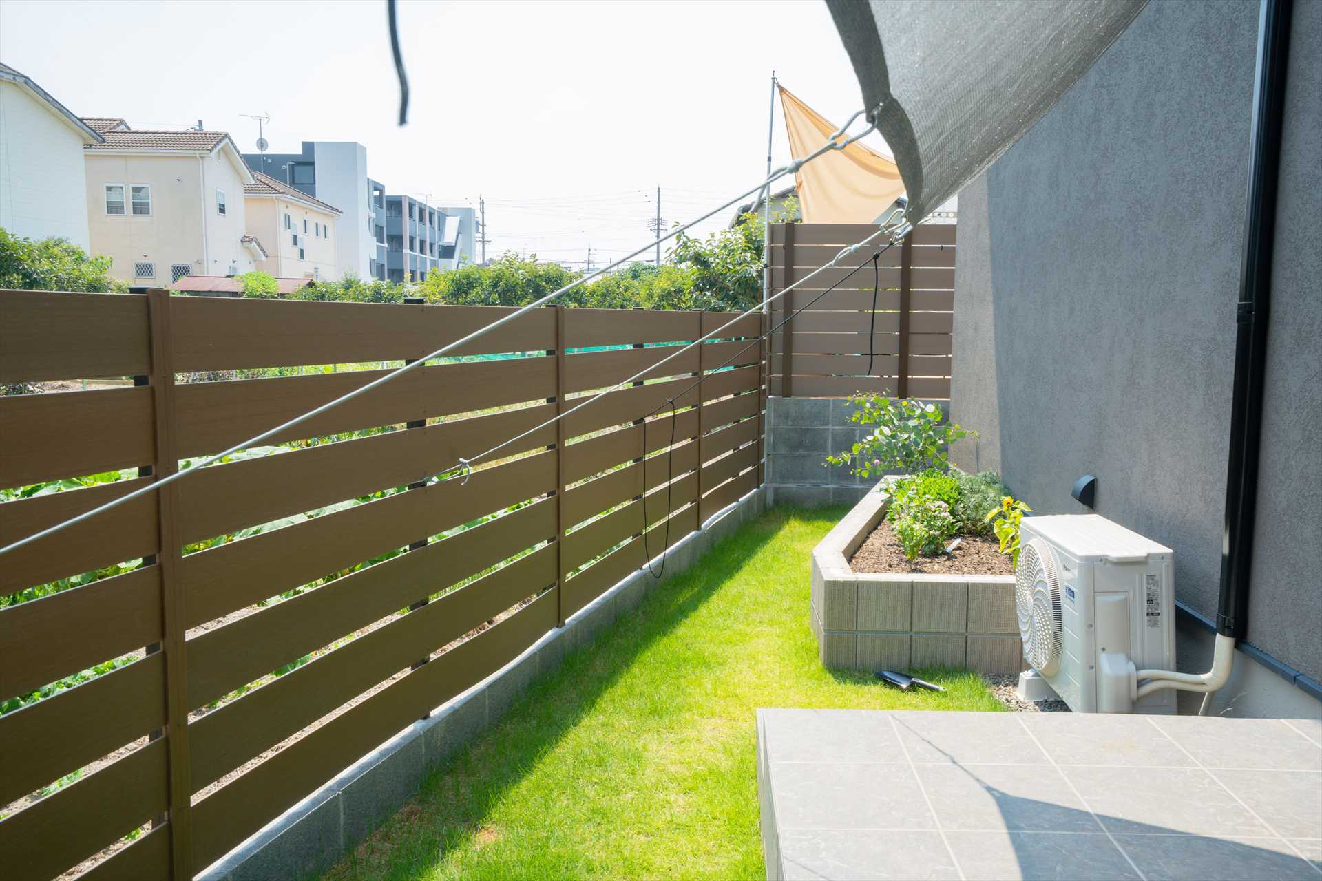 石目調の門袖は、駐車を妨げないスマートな動線と意匠性を両立、シンボルツリーが程よい抜け感を与え、足元の割栗石が都会的なデザインに自然の力強さを添えます。目隠しフェンスで守られたプライベートガーデンには、美しい天然芝と家庭菜園を愉しめる空間が広がり、機能性と暮らしの豊かさが共鳴することで、建物の美しさを最大限に引き立てる住まいが完成しました。